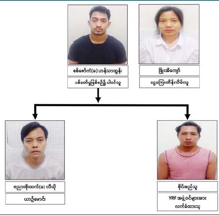 - နိုဝင်ဘာလ ၄ ရက်တွင် မရမ်းကုန်းမြို့နယ်ရှိ Mytel GM ဦးသိန်းအောင် အား ပစ်ခတ်ရန်အတွက် (YFA) အဖွဲ့ဝင် ၁ ဦးထံ ပစ္စတို ၁ လက်ဌားရမ်းပေးခဲ့ ကြောင်းနှင့် ပစ်ခတ်မှု ဖြစ်စဉ်တွင် တရားခံ စစ်ဇော်ကံ(ခ)ဟန်သာထွန်းနှင့် ဗညားစိုးထက်(ခ) လီယို၊ ဖြိုးအိကျော်နှင့် စိုင်းစည်သူတို့ ၄ ဦးအား ဖမ်းဆီး ရမိခဲ့သည်။