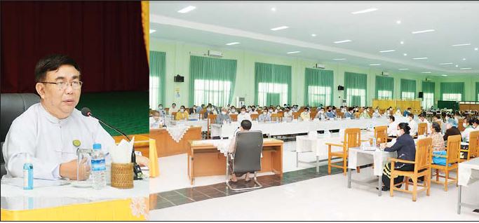 အစည်းအဝေးတွင် ပညာရေးဝန်ကြီးဌာန ပြည်ထောင်စုဝန်ကြီး ဒေါက်တာညွန့်ဖေက တိုင်းဒေသကြီး၊ ခရိုင်၊ မြို့နယ်တို့တွင် ရာထူးအဆင့်ဆင့်ဖြင့် တာဝန်ထမ်းဆောင်ကြရာ၌ နိုင်ငံတော် ဝန်ကြီးချုပ်မှာကြားသည့်အတိုင်း မိမိတို့အဆင့် အတန်းနှင့်လျော်ညီစွာ လုပ်ငန်း တာဝန်ကျေပွန်အောင် ကြိုစားဆောင်ရွက်ကြစေလိုပါကြောင်း၊ မူလတန်းပြ၊ အလယ်တန်းပြ၊ အထက်တန်းပြ သင်ကြားရေး ဆရာ ဆရာမအသစ်များ မွမ်းမံ သင်တန်းတက်ရောက်ပြီးပါက မကြာခင် လုပ်ငန်းခွင် သို့ ဝင်ရောက်လာမည်ဖြစ်ပါကြောင်း၊ ပညာရေးမှူး များအနေဖြင့် ရောက်ရှိလာသည့် ဆရာ၊ ဆရာမများ အားအရေအတွက်သာမကအရည်အချင်းပြည့်ဝသည့် ဆရာ၊ ဆရာမများဖြစ်စေရန် လက်တွဲခေါ်ယူ၍ အရည်အသွေးမြှင့်တင် ပေးကြရမည် ဖြစ်ပါကြောင်း၊ ဆရာ၊ ဆရာမများကိုယ်တိုင် ပညာအရည်အသွေး ပြည့်ဝမှသာ အရည်အသွေးပြည့်ဝသော အနာဂတ်သားကောင်း ရတနာများကို ပြုစုပျိုးထောင်မွေးထုတ် ပေးနိုင်မည်ဖြစ် ပါကြောင်း။