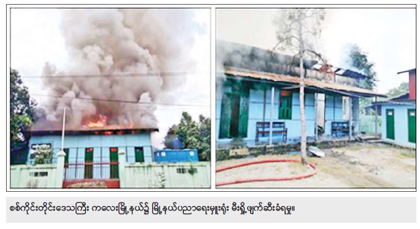 ထို့အပြင် စစ်ကိုင်းတိုင်းဒေသကြီး ကလေးမြို့နယ် တောင်ဇလပ်ရပ်ကွက် နယ်မြေ ၆ ရှိမြို့နယ် ပညာရေးမှူးရုံးကို အကြမ်းဖက်သမားများက ယနေ့နံနက် ၇ နာရီ မိနစ် ၂၀ ခန့်တွင် ရုံးအဆောက် အဦ၏ တောင်ဘက်ပြတင်းပေါက်မှ ဝင်ရောက်ကာ မီးရှို့ ထွက်ပြေးသွားခဲ့၍ မီးလောင်နေကြောင်း သတင်းအရ လုံခြုံရေးတပ်ဖွဲ့ဝင်များနှင့် မီးသတ် တပ်ဖွဲ့ဝင်များ ပါဝင်သော ပူးပေါင်း အဖွဲ့က မီးသတ်ယာဉ် ငါးစီးဖြင့် သွားရောက်မီးငြိမ်းသတ်ခဲ့ရာ နံနက် ၇ နာရီ ၄၅ မိနစ်တွင် မီးငြိမ်းသွားခဲ့ပြီး မီးလောင်မှုကြောင့် အုတ်ကာ/ကွန်ကရစ်ခင်း/သွပ်မိုး တစ်ထပ် ရုံးအဆောက်အဦ တစ်လုံးနှင့် ရုံးအတွင်း ရှိအသုံးအဆောင်ပစ္စည်းများ မီးလောင်ပျက်စီးခဲ့ ကြောင်း သိရသည်။