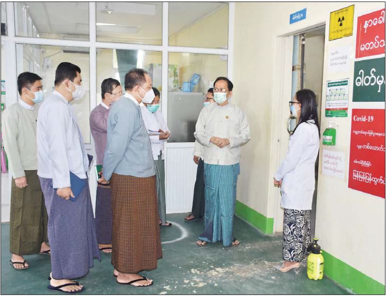 မွန်းလွဲပိုင်းတွင် တောင်ငူမြို့ ပြည်သူ့ဆေးရုံကြီး သို့ ရောက်ရှိပြီး ခွဲစိတ်ခန်း၊ ကိုဗစ်-၁၉ ရောဂါပိုးတွေ့ လူနာ အထူးကြပ်မတ်ကုသမှုဌာန၊ ကိုဗစ်-၁၉ အရေးပေါ်တုံ့ပြန်ရေး စီမံချက်အရ Ventilators များ ရောက်ရှိတပ်ဆင်ထားရှိမှု၊ ဓာတ်ခွဲခန်း၊ ဓာတ်မှန်ခန်း၊ အရိုးနှင့် ထိခိုက်ဒဏ်ရာလူနာ) ခွဲစိတ်လူနာဆောင်၊ Oxygen Plant များ တပ်ဆင်လုပ်ငန်း ဆောင်ရွက်နေမှုတို့ကို လှည့်လည်ကြည့်ရှု စစ်ဆေးသည်။