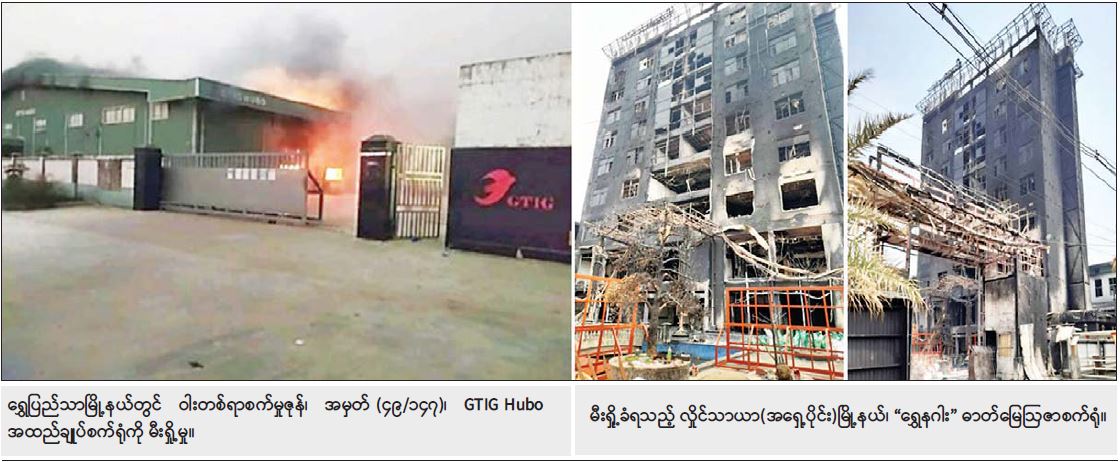 ထိုသို့ အကြမ်းဖက်အဖွဲ့များ၏ အကြောင်းမဲ့ မိုင်းထောင်ဖောက်ခွဲ၊ မီးရှို့ ဖျက်ဆီးခြင်း စသည့် အကြမ်း ဖက်လုပ်ရပ်များ လုပ်ဆောင်ခဲ့ခြင်းကြောင့် ၂၀၂၁ ခုနှစ် ဖေဖော်ဝါရီ ၁ ရက်မှ နိုဝင်ဘာ ၂၀ ရက်အထိ စက်ရုံ၊ အလုပ်ရုံ ၂၃ ခုတို့ ပျက်စီးဆုံးရှုံးခဲ့ရမှုကို ဖော်ပြပါအတိုင်း တွေ့ရှိရသည်-