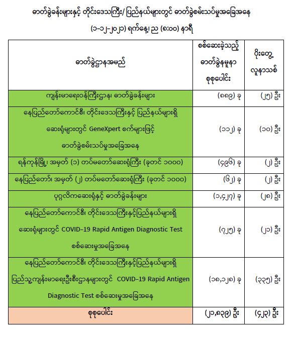 သို့ဖြစ်ပါ၍ ယနေ့အထိ ဓာတ်ခွဲနမူနာစုစုပေါင်း (၅,၆၀၅,၇၄၇) ခုအား စစ်ဆေးခဲ့ပြီး COVID-19 ဓာတ်ခွဲအတည်ပြုလူနာ စုစုပေါင်း (၅၂၂,၈၂၅) ဦး ရှိပြီ ဖြစ်ပါသည်။