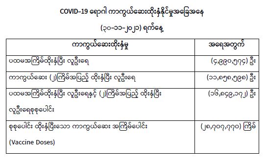 COVID-19 ရောဂါ ကာကွယ်ထိန်းချုပ်ရေးအတွက် တိုင်းဒေသကြီး/ပြည်နယ်များတွင် COVID-19 ရောဂါကာကွယ်ဆေးကို ဦးတည်အုပ်စု များသတ်မှတ်၍ ထိုးနှံပေးလျက်ရှိရာ (၃၀-၁၁-၂၀၂၁) ရက်နေ့ အထိ လူဦးရေ စုစုပေါင်း (၁၆,၈၄၉,၁၇၂) ဦးအား ထိုးနှံပေးပြီးဖြစ်၍ ကာကွယ်ဆေးနှစ်ကြိမ်အပြည့် ထိုးနှံပြီးစီးသူ (၁၁,၈၅၈,၅၉၈) ဦး နှင့် ပထမအကြိမ်ထိုးနှံပြီးစီးသူ (၄,၉၉၀,၅၇၄) ဦး ရှိပြီ ဖြစ်ပါသည်။ သို့ဖြစ်ပါ၍ (၃၀-၁၁-၂၀၂၁) ရက်နေ့အထိ မြန်မာနိုင်ငံတွင် COVID-19 ရောဂါကာကွယ်ဆေး အကြိမ်ရေ စုစုပေါင်း (၂၈,၇၀၇,၇၇၀) ကြိမ် ထိုးနှံပြီး ဖြစ်ပါသည်။