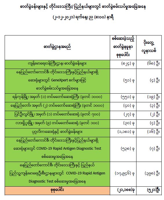 သို့ဖြစ်ပါ၍ ယနေ့အထိ ဓာတ်ခွဲနမူနာစုစုပေါင်း (၅,၆၂၆,၉၃၅) ခုအား စစ်ဆေးခဲ့ပြီး COVID-19 ဓာတ်ခွဲအတည်ပြုလူနာ စုစုပေါင်း (၅၂၃,၃၄၆) ဦးရှိပြီ ဖြစ်ပါသည်။