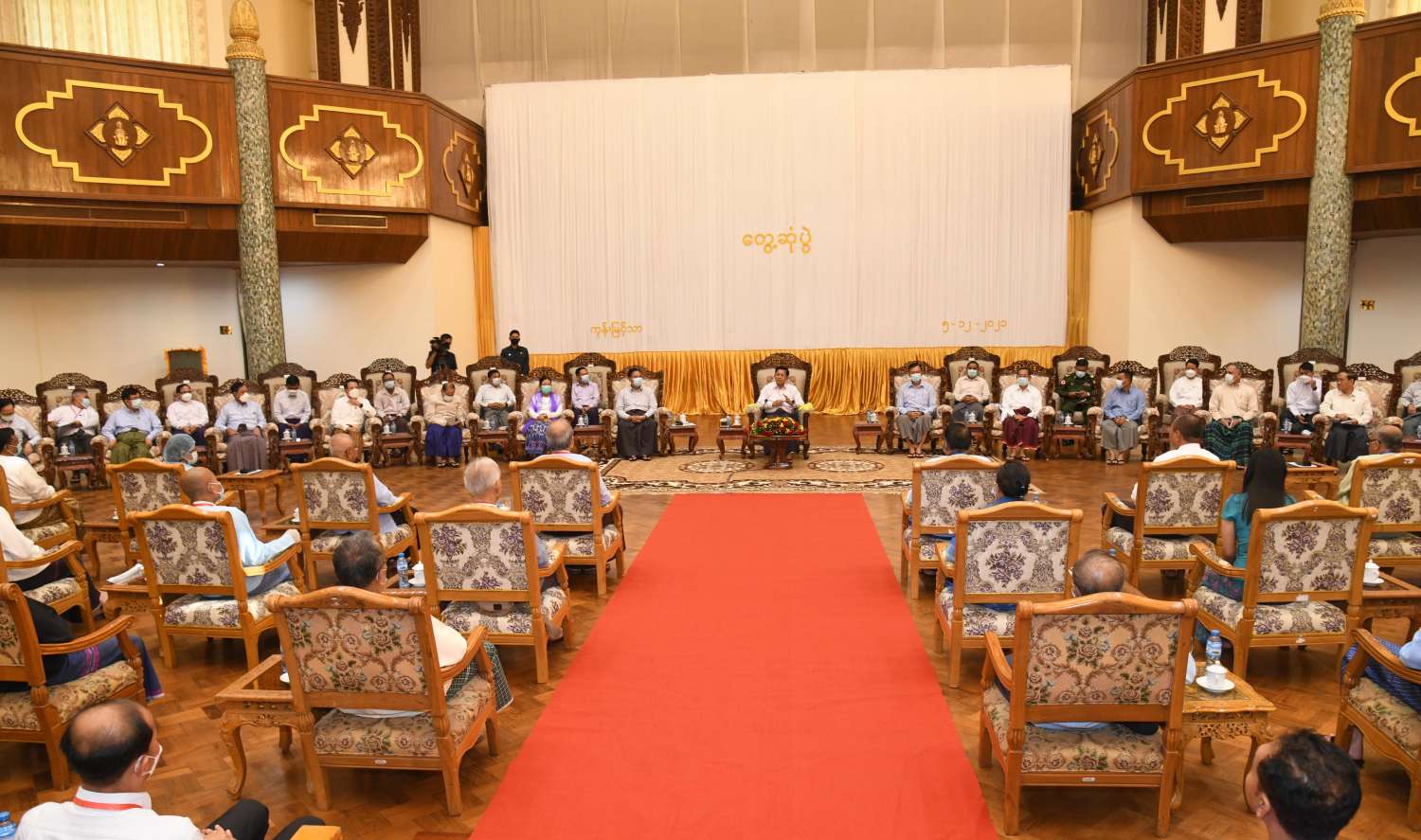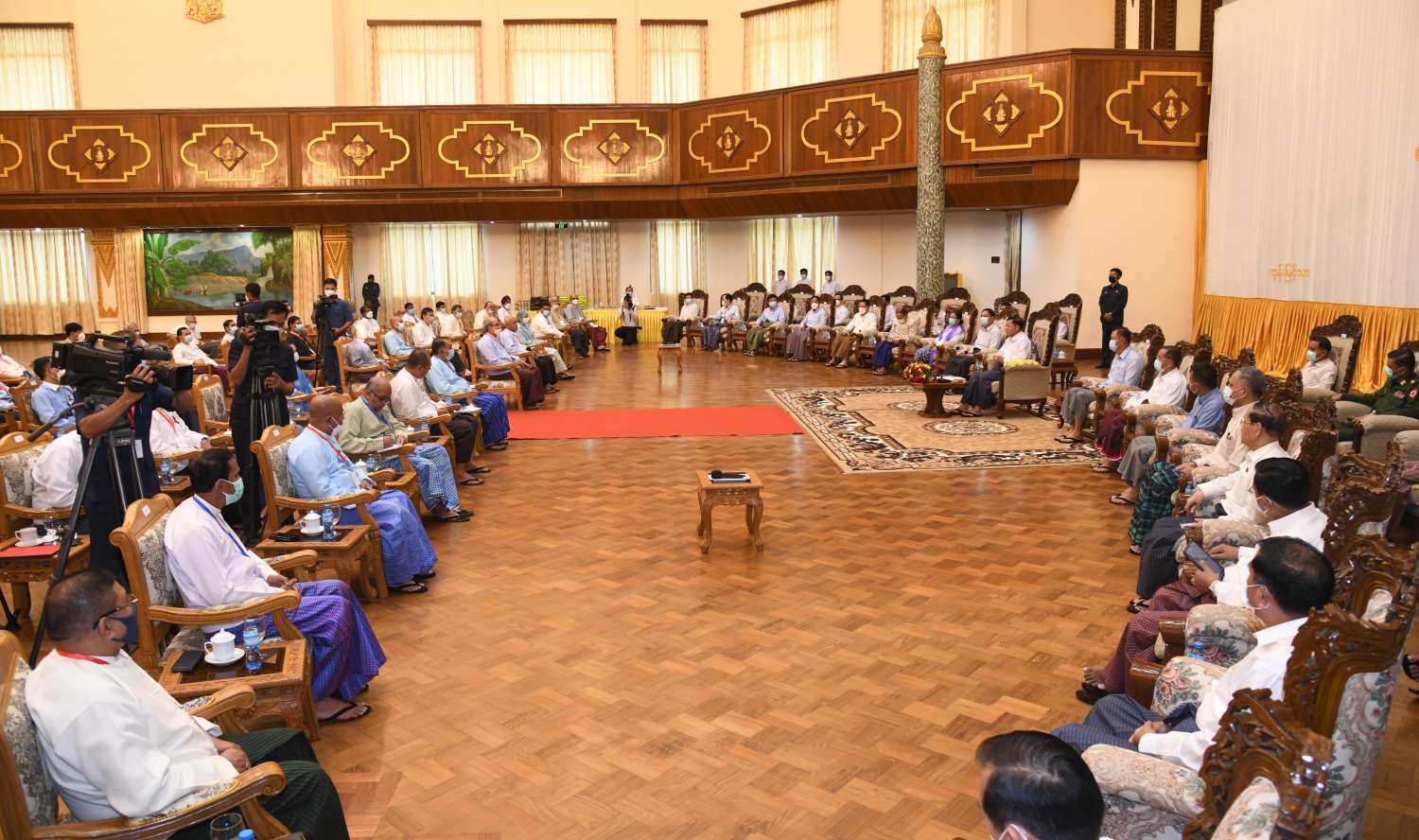 နိုင်ငံတော်စီမံအုပ်ချုပ်ရေးကောင်စီဥက္ကဋ္ဌ နိုင်ငံတော်ဝန်ကြီးချုပ် ဗိုလ်ချုပ်မှူးကြီး မင်းအောင်လှိုင် ဘာသာပေါင်းစုံ ချစ်ကြည်ညီညွတ်ရေး အဖွဲ့(ဗဟို)ဥက္ကဋ္ဌနှင့် အလုပ်အမှုဆောင်များအား ရင်းရင်းနှီးနှီးတွေ့ဆုံ၊ စားသောက်ဖွယ်ရာပစ္စည်းများပေးအပ်