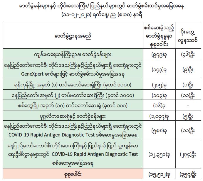 သို့ဖြစ်ပါ၍ ယနေ့အထိ ဓာတ်ခွဲနမူနာစုစုပေါင်း (၅,၇၈၂,၄၈၉) ခုအား စစ်ဆေးခဲ့ပြီး ကိုဗစ်-၁၉ ဓာတ်ခွဲအတည်ပြုလူနာစုစုပေါင်း (၅၂၆,၃၈၁) ဦး ရှိပြီဖြစ်ပါသည်။