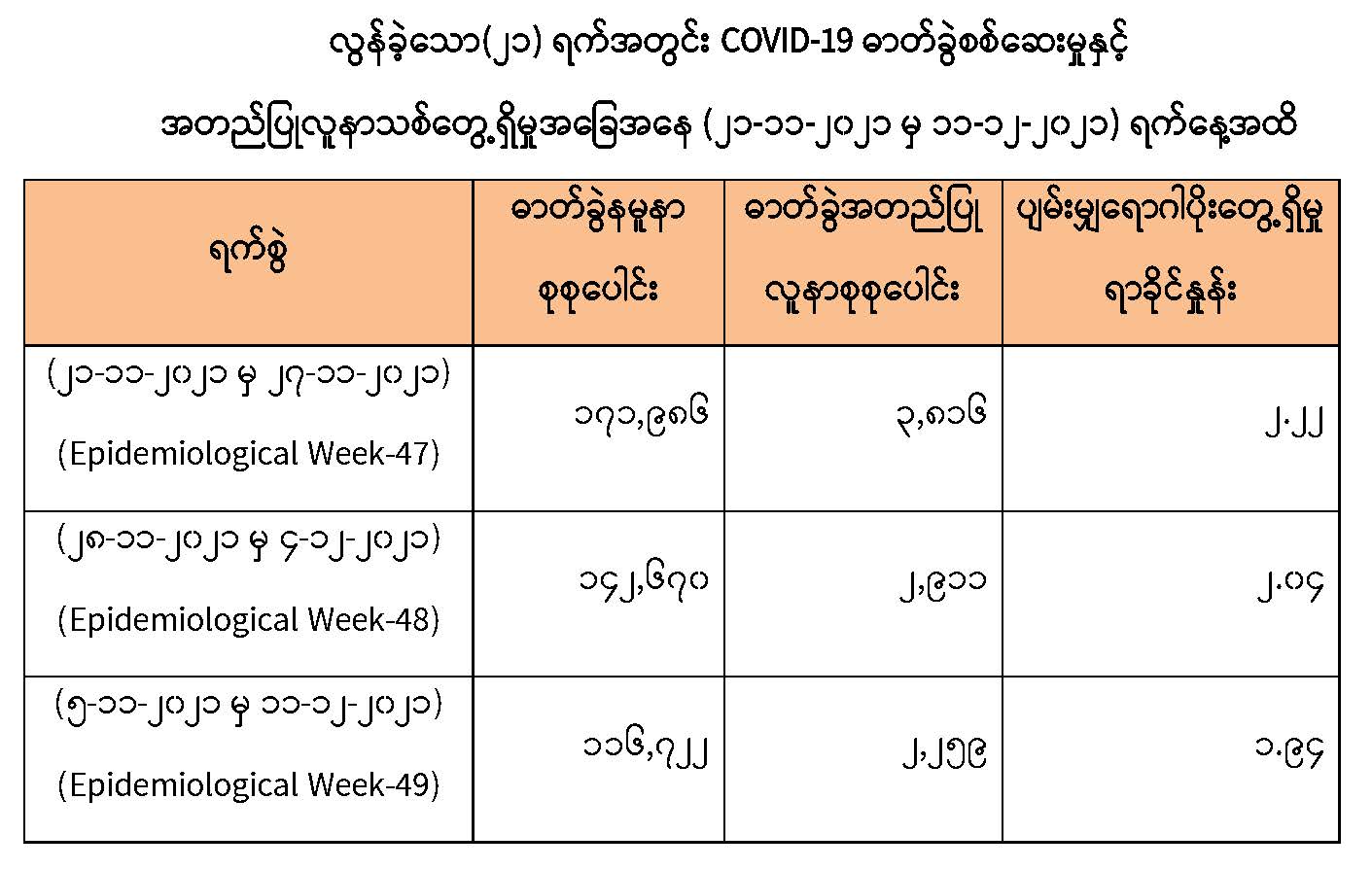 ကျန်းမာရေးဝန်ကြီးဌာနအနေဖြင့် ကိုဗစ်-၁၉ ရောဂါကူးစက်ဖြစ်ပွားမှု အခြေအနေများအား ကူးစက်ရောဂါစောင့်ကြပ်ကြည့်ရှုရေး ရက်သတ္တပတ်အလိုက် ဓာတ်ခွဲနမူနာရယူစစ်ဆေးမှု၊ ဓာတ်ခွဲအတည်ပြုလူနာ တွေ့ရှိရမှုနှင့် ရောဂါပိုးတွေ့ရှိမှုနှုန်း အခြေအနေများအား စောင့်ကြပ် ကြည့်ရှုလျက်ရှိရာ အပတ်စဉ် (၄၇)၊ အပတ်စဉ် (၄၈) နှင့် အပတ်စဉ် (၄၉) တို့ကို နှိုင်းယှဉ်ချက် အရ  ဓာတ်ခွဲအတည်ပြုလူနာတွေ့ရှိမှုနှင့် ပျမ်းမျှရောဂါပိုးတွေ့ရှိမှုနှုန်းများမှာ အပတ်စဉ်အလိုက် လျော့နည်း ကျဆင်းလျက်ရှိကြောင်း တွေ့ရှိရပါသည်။