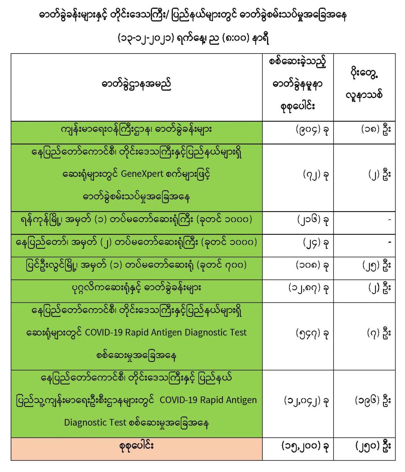 သို့ဖြစ်ပါ၍ ယနေ့အထိ ဓာတ်ခွဲနမူနာစုစုပေါင်း (၅,၈၀၉,၂၂၆) ခုအားစစ်ဆေးခဲ့ပြီး COVID-19 ဓာတ်ခွဲအတည်ပြုလူနာ စုစုပေါင်း (၅၂၆,၉၁၁) ဦး ရှိပြီ ဖြစ်ပါသည်။