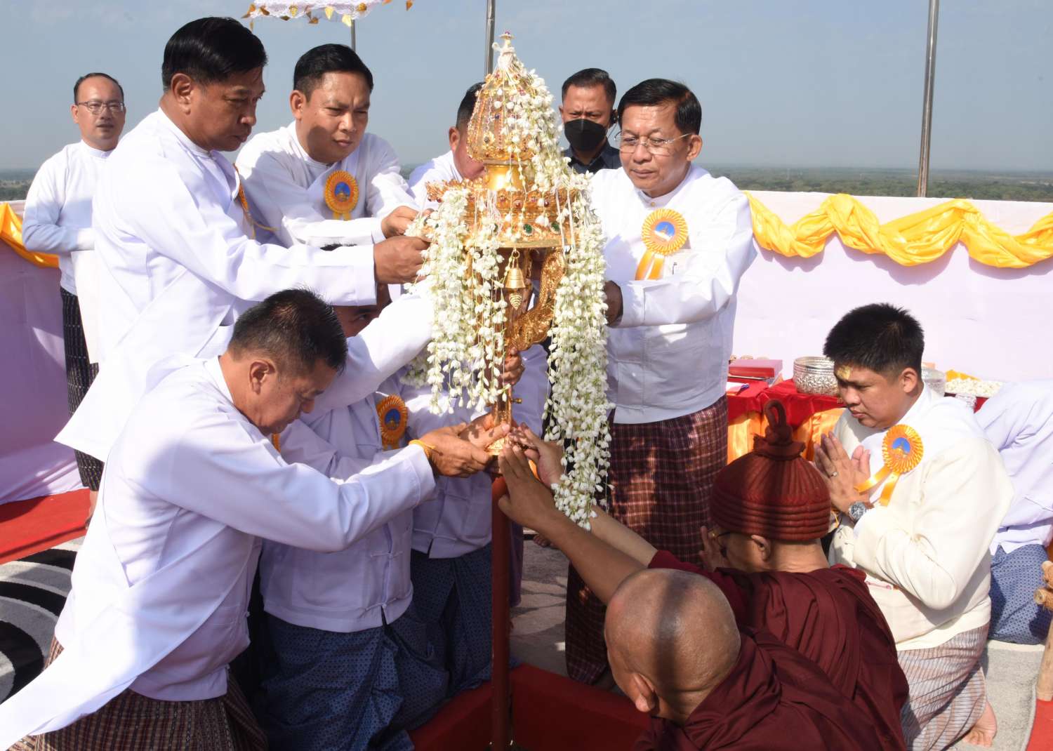 ထို့နောက် နိုင်ငံတော်စီမံအုပ်ချုပ်ရေးကောင်စီဥက္ကဋ္ဌ၊ နိုင်ငံတော်ဝန်ကြီးချုပ်၊ ဇနီး၊ မိသားစုဝင်များနှင့် အဖွဲ့ဝင်များသည် ရတနာစိန်ဖူးတော်၊ ငှက်မြတ်နား တော်တို့အား ပင့်ဆောင်၍ စေတီတော်ကြီးအား လက်ယာရစ် လှည့်လည်ပင့်ဆောင် ပူဇော်ကြသည်။ ထို့နောက် မင်္ဂလာအချိန်တွင် ရတနာစိန်ဖူးတော်၊ ငှက်မြတ်နားတော်တို့အား မင်္ဂလာ ရထားပျံဖြင့် စေတီတော်အထွတ်သို့ ပင့်ဆောင်၍ ပရိတ်နံ့သာရည်များ ပက်ဖျန်းကြကာ ရတနာစိန်ဖူးတော်၊ ငှက်မြတ်နားတော် တင်လှူပူဇော်အောင်မြင်ခြင်း အထိမ်းအမှတ် ရတနာ ရွှေမိုး၊ ငွေမိုးများ ရွာသွန်းဖြိုးကြသည်။