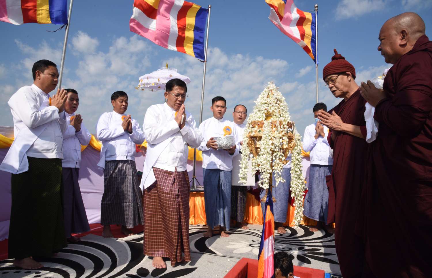 ဦးစွာ နိုင်ငံတော်စီမံအုပ်ချုပ်ရေးကောင်စီ ဥက္ကဋ္ဌ၊ နိုင်ငံတော်ဝန်ကြီးချုပ်၊ ဇနီးနှင့်အခမ်းအနား တက်ရောက်လာကြသူများက ဗဟန်းညောင်တုန်းကျောင်းတိုက် နာယက ဆရာတော်ထံမှ ကိုးပါးသီလခံယူဆောက်တည်ကြပြီး ဥပါသကာများက ပရိတ်ပန်း၊ ပရိတ်ရေ၊ ပရိတ်ချည်၊ ပရိတ်သဲများကို သံဃာတော်များထံ ဆက်ကပ်သည်။ ထို့နောက် သံဃာတော်အရှင်သူမြတ်တို့ ရွတ်ပွားချီးမြှင့်တော်မူကြသည့် ပရိတ်တရားတော်များကို နာယူကြည်ညိုကြသည်။