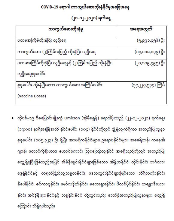 COVID-19 ရောဂါ ကာကွယ်ထိန်းချုပ်ရေးအတွက် တိုင်းဒေသကြီး/ပြည်နယ်များတွင် COVID-19 ရောဂါကာကွယ်ဆေးကို ဦးတည်အုပ်စုများသတ်မှတ်၍ ထိုးနှံပေးလျက်ရှိရာ (၂၁-၁၂-၂၀၂၁) ရက်နေ့ အထိ လူဦးရေ စုစုပေါင်း (၂၀,၁၀၉,၄၉၅) ဦးအား ထိုးနှံပေးပြီးဖြစ်၍ ကာကွယ်ဆေး နှစ်ကြိမ်အပြည့် ထိုးနှံပြီးစီးသူ (၁၄,၁၁၈,၀၃၉) ဦးနှင့် ပထမအကြိမ်ထိုးနှံပြီးစီးသူ (၅,၉၉၁,၄၅၆) ဦး ရှိပြီဖြစ်ပါသည်။ သို့ဖြစ်ပါ၍ (၂၁-၁၂-၂၀၂၁) ရက်နေ့အထိ မြန်မာနိုင်ငံတွင် COVID-19 ရောဂါကာကွယ်ဆေး အကြိမ်ရေ စုစုပေါင်း (၃၄,၂၂၇,၅၃၄) ကြိမ် ထိုးနှံပြီး ဖြစ်ပါသည်။