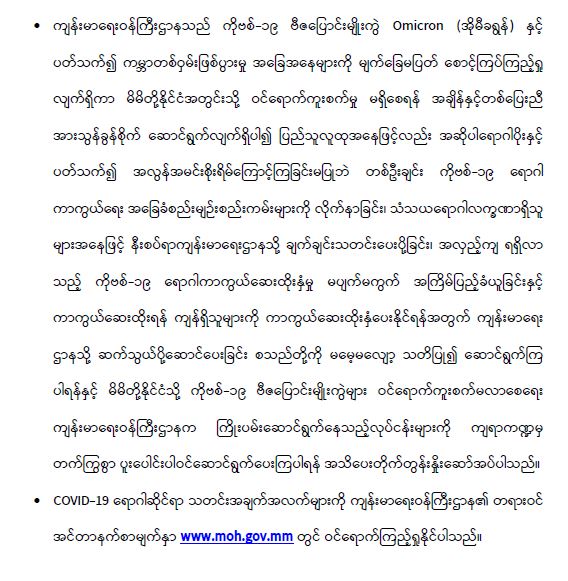 ကျန်းမာရေးဝန်ကြီးဌာနအနေဖြင့် နိုင်ငံအတွင်း ကူးစက်ဖြစ်ပွားနေသော COVID-19 ရောဂါ ကာကွယ်၊ ကုသ၊ ထိန်းချုပ်ရေး လုပ်ငန်းများကို အရှိန်အဟုန်မြှင့် ဆောင်ရွက်လျက်ရှိရာ ရောဂါ ထိန်းချုပ်ရေး လုပ်ငန်းများ အောင်မြင်နိုင်ရေးအတွက် ပြည်သူလူထုအနေဖြင့် ကျန်းမာရေး ဝန်ကြီး ဌာနမှထုတ်ပြန်ထားသော COVID-19 ရောဂါ ကာကွယ် ထိန်းချုပ်ရေးဆိုင်ရာ စည်းကမ်းများကို စနစ်တကျ လိုက်နာဆောင်ရွက်ရန်လိုအပ်ပြီး COVID-19 ကာကွယ်ဆေးထိုးနှံမှု ခံယူခြင်း အား အထူးဂရုပြု ပူးပေါင်းဆောင်ရွက်ကြရန် လိုအပ်ပါသည်။