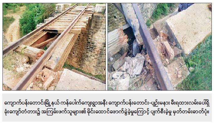 နိုင်ငံတော်တည်ငြိမ်အေးချမ်းမှုကို မလိုလားသည့် PDF အမည်ခံ အကြမ်းဖက်သမားများက ခရီးသည်တင်မီးရထားတစ်စင်း မိုင်းဆွဲတိုက်ခိုက်ခြင်းနှင့် လမ်းပန်းဆက်သွယ်ရေး ပြတ်တောက်စေရန်အတွက် မီးရထားသံလမ်းများပေါ်၌ မိုင်းထောင်ဖောက်ခွဲခြင်းပြုလုပ်