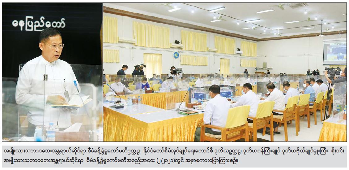 အမျိုးသားသဘာ၀ဘေးအန္တရာယ်ဆိုင်ရာ စီမံခန့်ခွဲမှုကော်မတီ အစည်းအဝေး (၂/၂၀၂၁) ကို ယနေ့မွန်းလွဲ ၁ နာရီတွင် နေပြည်တော်ရှိ လူမှုဝန်ထမ်း၊ ကယ်ဆယ်ရေးနှင့် ပြန်လည်နေရာ ချထားရေးဝန်ကြီးဌာန အစည်းအဝေးခန်းမ၌ကျင်းပရာ အမျိုးသားသဘာ၀ဘေး အန္တရာယ်ဆိုင်ရာ စီမံခန့်ခွဲမှု ကော်မတီ ဥက္ကဋ္ဌ၊ နိုင်ငံတော်စီမံအုပ်ချုပ်ရေး ကောင်စီဒုတိယဥက္ကဋ္ဌ၊ ဒုတိယဝန်ကြီးချုပ် ဒုတိယဗိုလ်ချုပ်မှူးကြီးစိုးဝင်း တက်ရောက်အမှာစကား ပြောကြားသည်။