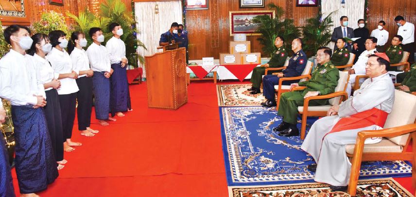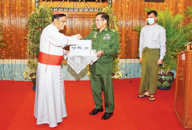 နိုင်ငံတော်စီမံအုပ်ချုပ်ရေးကောင်စီဥက္ကဋ္ဌ နိုင်ငံတော်ဝန်ကြီးချုပ် ဗိုလ်ချုပ်မှူးကြီး မင်းအောင်လှိုင် ကက်သလစ် ဂိုဏ်းချုပ် ဆရာတော်ကြီး ကာဒီနယ်ချားလ်စ်ဘိုက ကျင်းပပေးသည့် ၂၀၂၁ ခုနှစ် ခရစ္စမတ်နေ့အထိမ်းအမှတ် စုပေါင်းဂုဏ်ပြုဆုတောင်းပွဲသို့ တက်ရောက်ချီးမြှင့်
