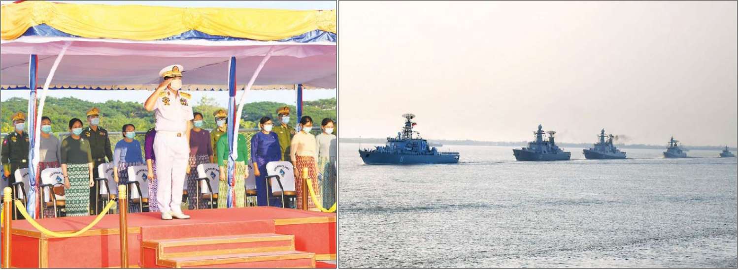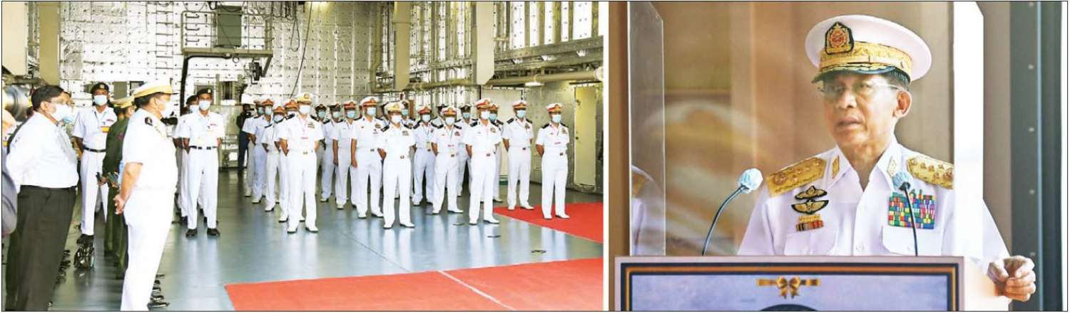 ၎င်းနောက် နိုင်ငံတော်စီမံအုပ်ချုပ်ရေးကောင်စီဥက္ကဋ္ဌ တပ်မတော်ကာကွယ်ရေး ဦးစီးချုပ်နှင့်အဖွဲ့ဝင် များသည် တပ်တော်ဝင်စစ်ရေယာဉ်များဖြစ်သည့် ရေငုပ်သင်္ဘော စစ်ရေယာဉ်(မင်းရဲကျော်ထင်) အပါအဝင် ကမ်းလွန်ရေယာဉ်တစ်စီး၊ မြစ်တွင်းသွား ကင်းလှည့် ရေယာဉ် ၂ စီးနှင့် မြစ်တွင်းအမြန်သွား ကင်းလှည့်ရေယာဉ် ၂ စီး တို့အား လှည့်လည်ကြည့်ရှုကြရာ တာဝန်ရှိသူများ က လိုက်လံရှင်းလင်း ပြသကြသည်။
