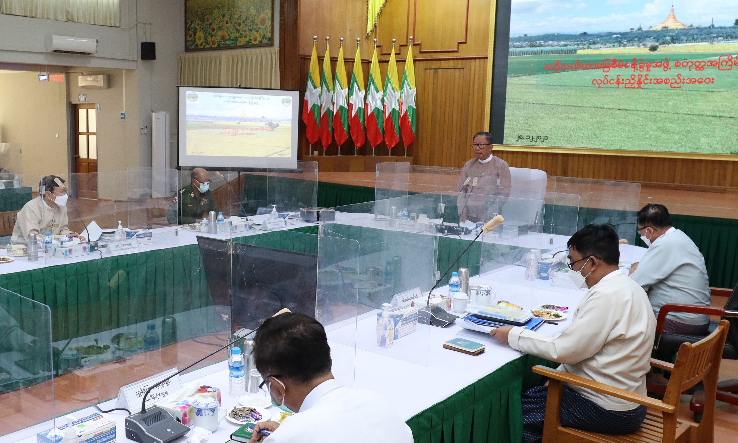 နိုင်ငံ၏အဓိကစားနပ်ရိက္ခာဖြစ်သည့် ဆန်စပါးဖူလုံရေး၊ ဒေသအတွင်း သီးနှံ ထုတ်လုပ်မှု မြင့်မားရေး နှင့် စိုက်ပျိုးမွေးမြူရေးကိုအခြေခံသည့် စီးပွားဖွံ့ဖြိုးမှု တိုးတက်လာရေး အတွက် လယ်ယာမြေ များကို တည်ဆဲဥပဒေ နည်းဥပဒေများနှင့်အညီ စီမံဆောင်ရွက်လျက်ရှိသည့် ဗဟို လယ်ယာမြေ စီမံခန့်ခွဲမှုအဖွဲ့၏ လုပ်ငန်းညှိနှိုင်းအစည်းအဝေးကို ယနေ့ မွန်းလွဲပိုင်းက စိုက်ပျိုးရေး၊ မွေးမြူရေးနှင့် ဆည်မြောင်းဝန်ကြီးဌာန ပြည်ထောင်စု ဝန်ကြီးရုံး အစည်းအဝေးခန်းမတွင် ကျန်းမာ ရေးဆိုင်ရာ ညွှန်ကြားချက်များနှင့်အညီ ကျင်းပသည်။