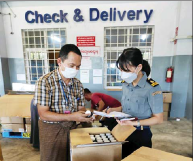 အကောက်ခွန်ဦးစီးဌာနအနေဖြင့် ကိုဗစ်-၁၉ ရောဂါ ကာကွယ်၊ ထိန်းချုပ်၊ ကုသရေးပစ္စည်းများ အား ရေကြောင်း၊ ဆိပ်ကမ်း၊ နယ်စပ်ဂိတ်အသီးသီးမှ နေ့စဉ်လွယ်ကူချောမွေ့စွာ စစ်ဆေးထုတ် ပေးလျက်ရှိသည်။ ဒီဇင်ဘာ ၂၉ ရက်၌ ရန်ကုန်ဆိပ်ကမ်းများမှ Wheel Chair ၁၂၇ ခု၊ Commode Chair ၅၀၀၊ Digital Blood Pressure Monitor ၃၀၀၀၊ Blood Pressure Monitor Bp3UG1-2E ၃၀၀၀၈၊ Auto Matic Blood Pressure Monitor ၃၀၀၀၊ Blood Pressure Monitor BP3NM1-3E ၃၀၀၀၊ PEN Type Digital Thermometer ၃၀၀၀၊ High Low Stretcher ၂၈ ခု၊ Scoop Stretcher ၂၀၊ Female Examining Table ၅ ခု၊ Head Immobilize ၁၀ ခု၊ Stretcher ၅၀၊ Belt For Stretcher ၃၀၊ Electrocardiograph ၂၀၊ Internitient Pneumatic Compression ငါးခု၊ Revolizer ၅၃၂၀၊ ဆေးဝါးမျိုးစုံ ၃၈ မျိုး စုစုပေါင်း ၁၀၈၃၈၃ ဒသမ ၈၅ KG၊ နယ်စပ်(မြဝတီ၊ ချင်းရွှေဟော်) တွင် ကုမ္ပဏီသုံးခုတို့မှ Pai Dido Injection ၂၄၀၀၀၊ Sai C Pen Powder For Injection ၁၀၀၆၀၊ Sai P Pen Powder For Injection ၈၅၀၀၊ Disposable Mask 8659 KG ၊ Surgical Gown ၇၅၀၀၊ Liquid Oxygen ၁၅၃၃၈ m3၊ Disposable Cap ၈၈၀ KG တို့ကို ထုတ်ပေးခဲ့ကြောင်း သတင်းရရှိသည်။