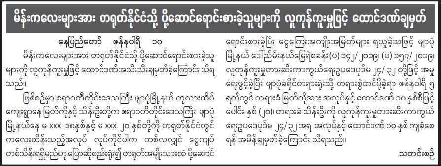 မိန်းကလေးများအား တရုတ်နိုင်ငံသို့ ပို့ဆောင်ရောင်းစားခဲ့သူများကို လူကုန်ကူးမှုဖြင့် ထောင်ဒဏ်ချမှတ်
