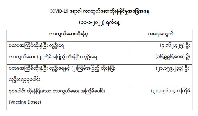 COVID-19 ရောဂါ ကာကွယ်ထိန်းချုပ်ရေးအတွက် တိုင်းဒေသကြီး/ပြည်နယ်များတွင် COVID-19 ရောဂါကာကွယ်ဆေးကို ဦးတည်အုပ်စုများသတ်မှတ်၍ ထိုးနှံပေးလျက်ရှိရာ (၁၁-၁-၂၀၂၂) ရက်နေ့ အထိ လူဦးရေ စုစုပေါင်း (2၁,၁၅၉,၂၃၃) ဦးအား ထိုးနှံပေးပြီးဖြစ်၍ ကာကွယ်ဆေးနှစ်ကြိမ် အပြည့် ထိုးနှံပြီးစီးသူ (1၆,9၉၆,၈၀၈) ဦး နှင့် ပထမအကြိမ်ထိုးနှံပြီးစီးသူ (4,၁၆၂,၄၂၅) ဦး ရှိပြီဖြစ်ပါသည်။ သို့ဖြစ်ပါ၍ (၁၁-၁-၂၀၂၂) ရက်နေ့အထိ မြန်မာနိုင်ငံတွင် COVID-19 ရောဂါကာကွယ်ဆေး အကြိမ်ရေ စုစုပေါင်း (3၈,၁၅၆,၀၄၁) ကြိမ် ထိုးနှံပြီး ဖြစ်ပါသည်။