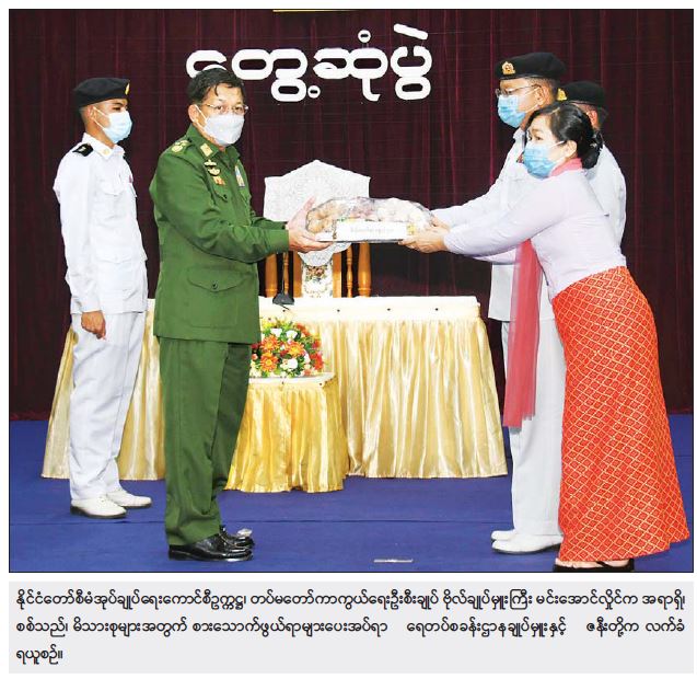 ယင်းနောက် နိုင်ငံတော်စီမံအုပ်ချုပ်ရေးကောင်စီဥက္ကဋ္ဌ တပ်မတော် ကာကွယ်ရေး ဦးစီးချုပ်က အရာရှိ၊ စစ်သည်၊ မိသားစုများအတွက် စားသောက်ဖွယ်ရာများ ပေးအပ်ရာ ရေတပ်စခန်း ဌာနချုပ်မှူးနှင့် ဇနီးတို့ကလက်ခံရယူကြသည်၊ ယင်းနာက် နိုင်ငံတော်စီမံအုပ်ချုပ်ရေး ကောင်စီဥက္ကဋ္ဌ တပ်မတော်ကာကွယ်ရေး ဦးစီးချုပ်သည် အရာရှိ၊ စစ်သည်၊ မိသားစုများအား ရင်းရင်းနှီးနှီးနှုတ်ဆက်ခဲ့ကြောင်း သတင်းရရှိသည်။