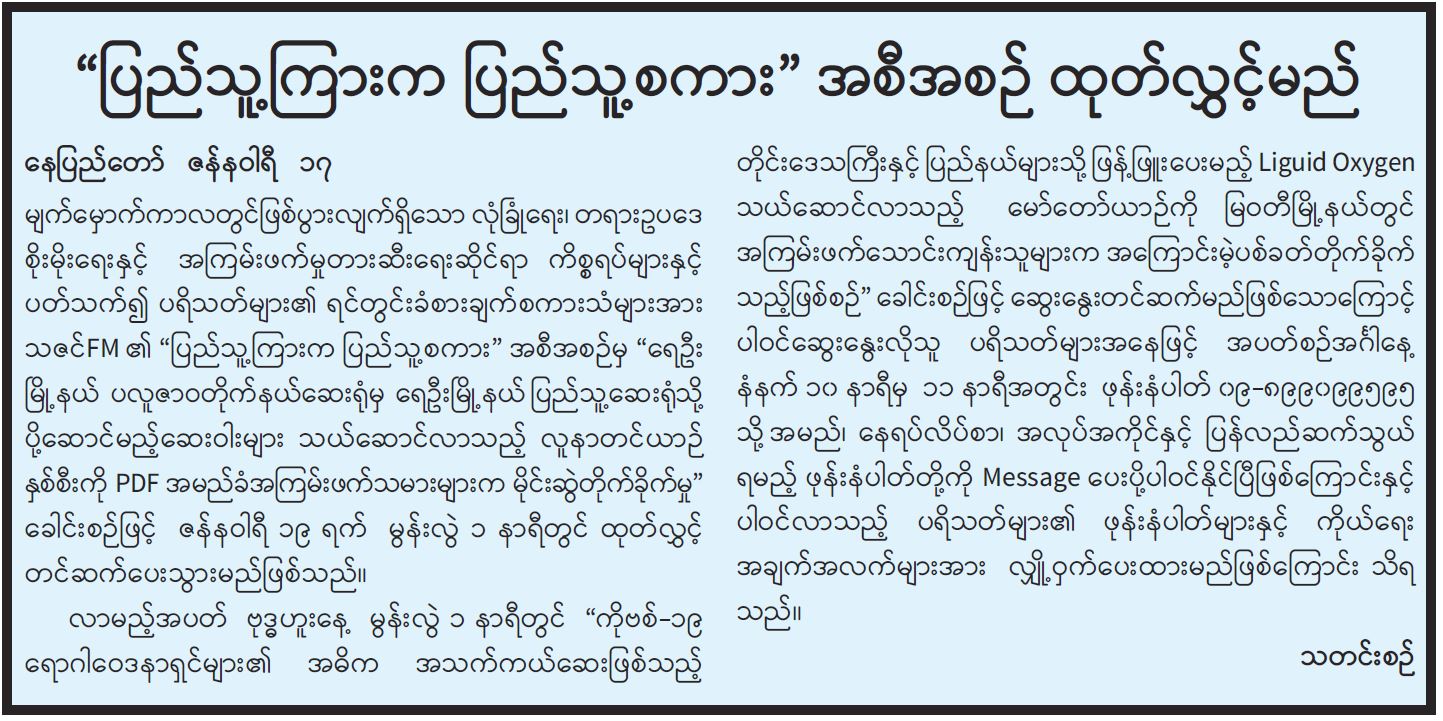 “ပြည်သူ့ကြားက ပြည်သူ့စကား” အစီအစဉ်ထုတ်လွှင့်မည်
