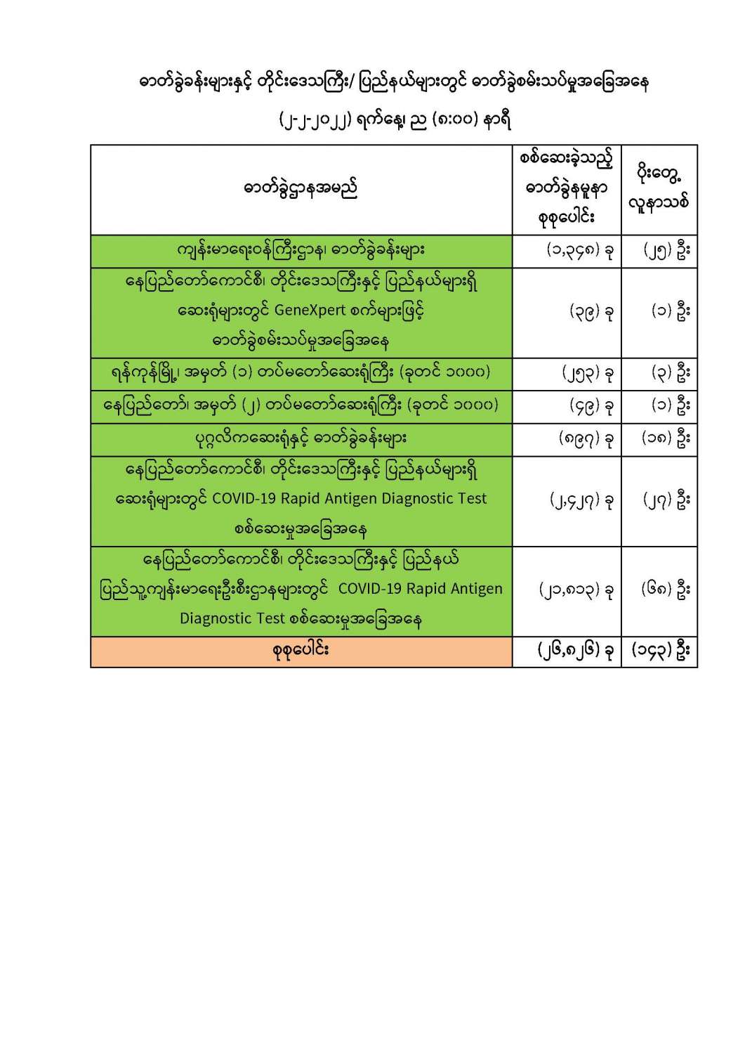 သို့ဖြစ်ပါ၍ ယနေ့အထိ ဓာတ်ခွဲနမူနာစုစုပေါင်း (,၄၂၀,၄၄၇) ခုအား စစ်ဆေးခဲ့ပြီး COVID-19 ဓာတ်ခွဲအတည်ပြုလူနာ စုစုပေါင်း (၅၃၆,၅၃၆) ဦး ရှိပြီဖြစ်ပါသည်။