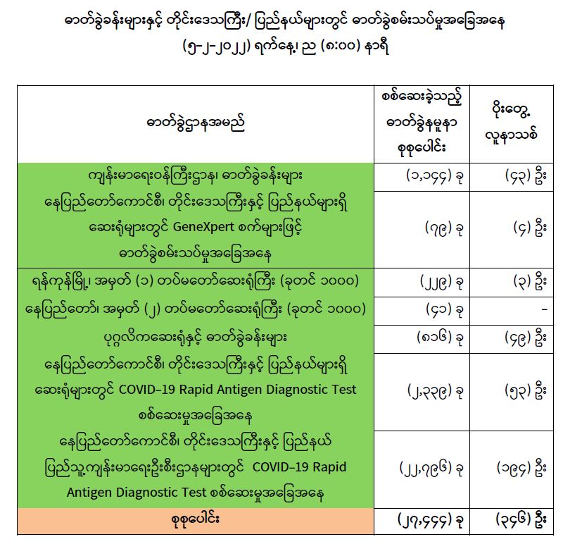 သို့ဖြစ်ပါ၍ ယနေ့အထိ ဓာတ်ခွဲနမူနာစုစုပေါင်း (၆,၄၉၇,၁၆၈) ခုအား စစ်ဆေးခဲ့ပြီး COVID-19 ဓာတ်ခွဲအတည်ပြုလူနာ စုစုပေါင်း (၅၃၇,၅၆၉) ဦး ရှိပြီ ဖြစ်ပါသည်။