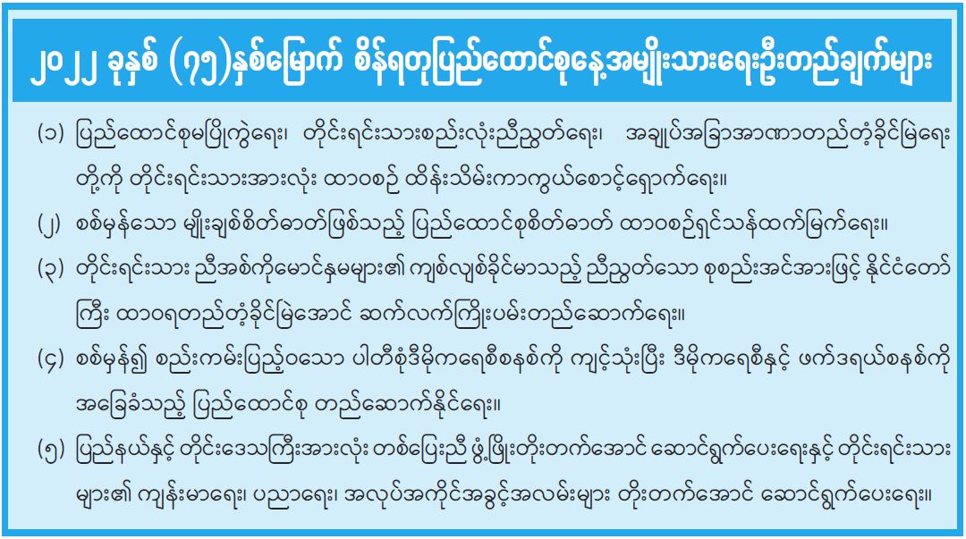 ၂၀၂၂ ခုနှစ် (၇၅)နှစ်မြောက် စိန်ရတုပြည်ထောင်စုနေ့ အမျိုးသားရေး ဦးတည်ချက်များ