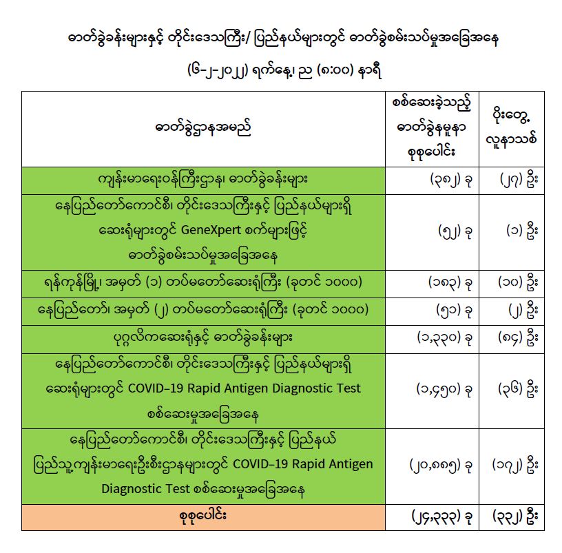 COVID-19 သံသယလူနာများ၊ ဓာတ်ခွဲအတည်ပြုလူနာနှင့် အနီးကပ်ထိတွေ့ခဲ့သူများနှင့် အသွားအလာကန့်သတ်ထားရှိသူများအား COVID-19 ရောဂါ ရှိ၊ မရှိ ဓာတ်ခွဲစမ်းသပ် စစ်ဆေးခြင်းအား ပုံမှန်ဆောင်ရွက်လျက်ရှိပြီး (၅-၂-၂၀၂၂) ရက်နေ့၊ ည (၈:၀၀) နာရီမှ (၆-၂-၂၀၂၂) ရက်နေ့၊ ည (၈:၀၀) နာရီအတွင်း ဓာတ်ခွဲနမူနာစုစုပေါင်း (၂၄,၃၃၃) ခုအား စစ်ဆေးပြီးစီးခဲ့ရာ COVID-19 ရောဂါ ဓာတ်ခွဲအတည်ပြုလူနာသစ် (၃၃၂) ဦး တွေ့ရှိရပါသည်။