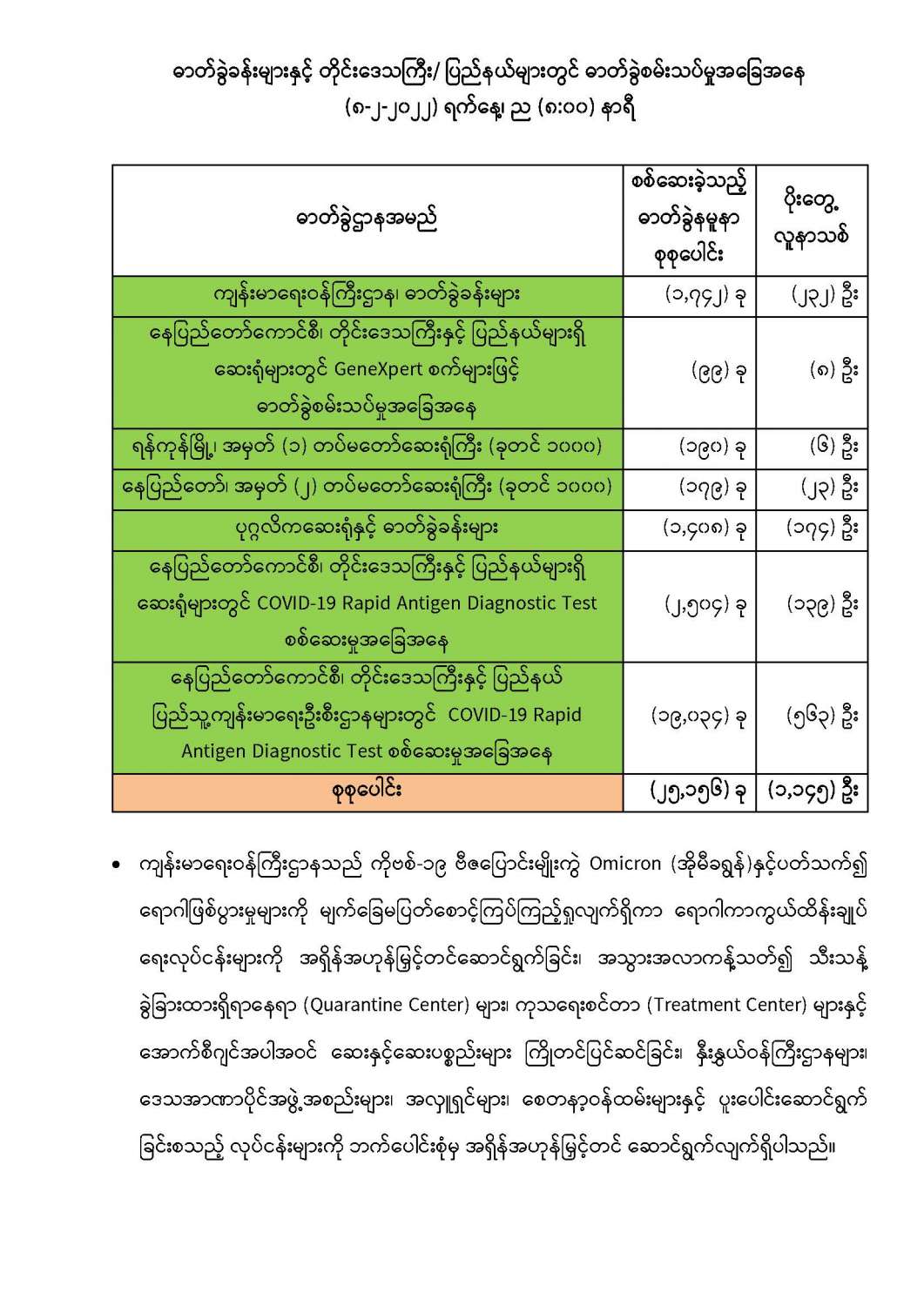 သို့ဖြစ်ပါ၍ ယနေ့အထိ ဓာတ်ခွဲနမူနာစုစုပေါင်း (၆,၅၇၁,၄၉၃) ခုအား စစ်ဆေးခဲ့ပြီး COVID-19 ဓာတ်ခွဲအတည်ပြုလူနာ စုစုပေါင်း (၅၃၉,၅၅၄) ဦး ရှိပြီ ဖြစ်ပါသည်။