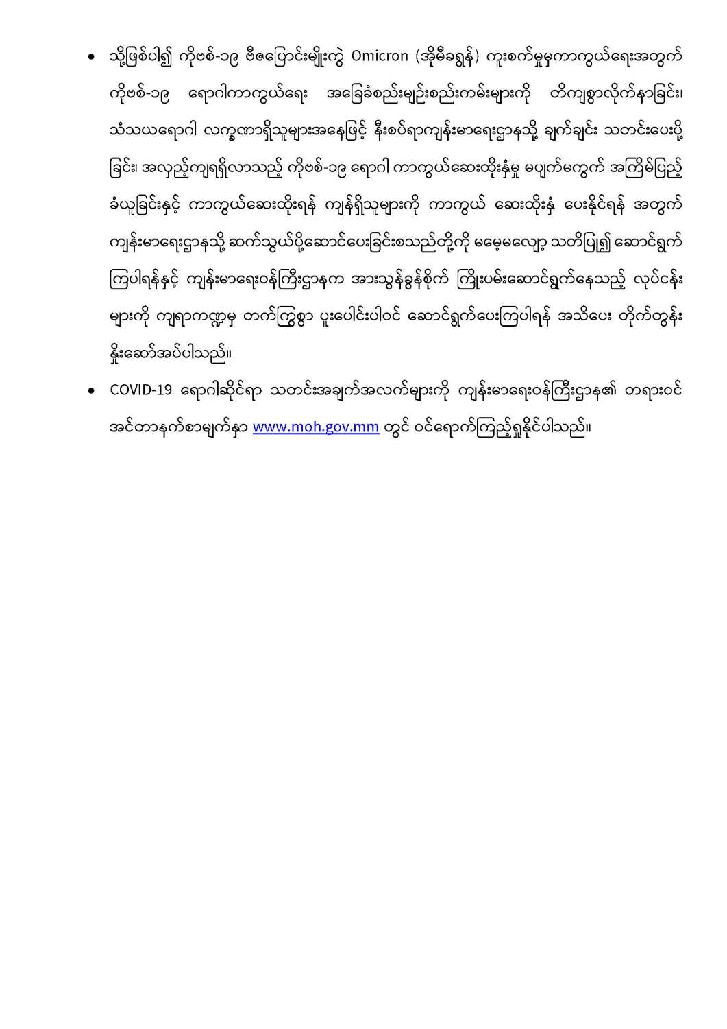 ကျန်းမာရေးဝန်ကြီးဌာနအနေဖြင့် နိုင်ငံအတွင်း ကူးစက်ဖြစ်ပွားနေသော COVID-19 ရောဂါ ကာကွယ်၊ ကုသ၊ ထိန်းချုပ်ရေးလုပ်ငန်းများကို အရှိန်အဟုန်မြှင့် ဆောင်ရွက်လျက်ရှိပါသည်။
