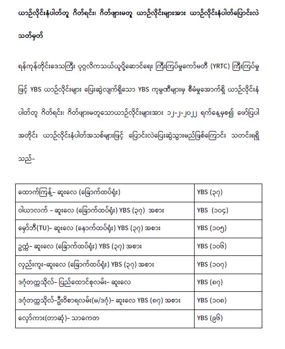 ရန်ကုန်တိုင်းဒေသကြီး ပုဂ္ဂလိကသယ်ယူပို့ဆောင်ရေး ကြီးကြပ်မှုကော်မတီ (YRTC) ကြီးကြပ်မှု ဖြင့် YBS ယာဉ်လိုင်းများ ပြေးဆွဲလျက်ရှိသော YBS ကုမ္ပဏီများမှ စီမံမှုအောက်ရှိ ယာဉ်လိုင်းနံ ပါတ်တူ ဂိတ်ရင်း၊ ဂိတ်ဖျားမတူသောယာဉ်လိုင်းများအား ၁၂-၂-၂၀၂၂ ရက်နေ့မှစ၍ ဖော်ပြပါ အတိုင်း ယာဉ်လိုင်းနံပါတ်အသစ်များဖြင့် ပြောင်းလဲပြေးဆွဲသွားမည်ဖြစ်ကြောင်း သတင်းရရှိသည်-
