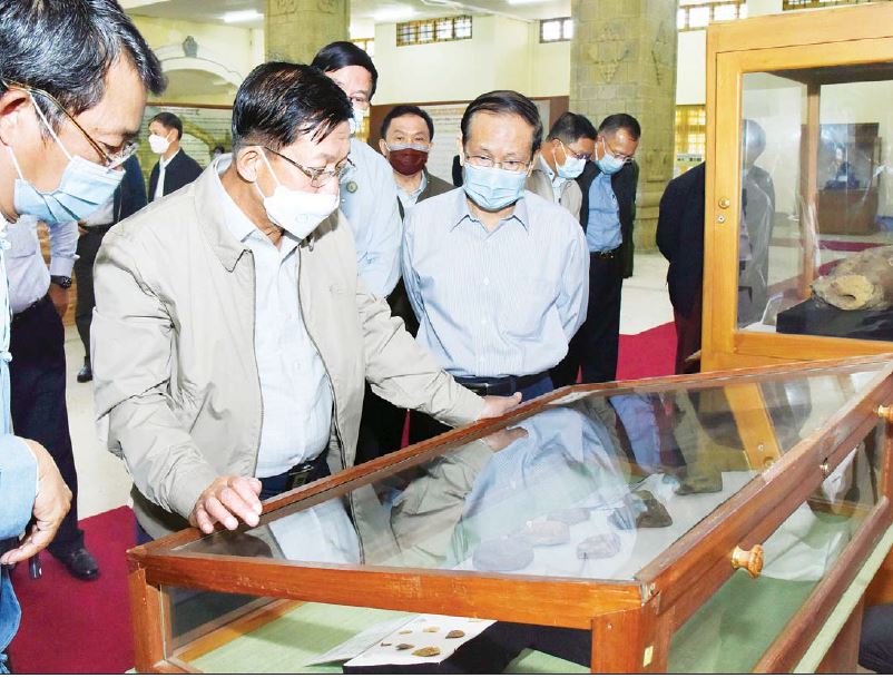 ထို့နောက် နိုင်ငံတော်စီမံအုပ်ချုပ်ရေးကောင်စီဥက္ကဋ္ဌ၊ နိုင်ငံတော်ဝန်ကြီးချုပ်၊ ဇနီးနှင့် အဖွဲ့ဝင်များသည် ပြတိုက်အတွင်းပြသထားရှိသည့် ဗိဿနိုးမြို့ဟောင်းမြေပုံ၊ မြို့ ဝင်ပေါက် မြို့ရိုး၊ ရှေးခေတ်အသုံးအဆောင်ပစ္စည်းများ၊ စာပေဆိုင်ရာအထောက်အထားများ၊ ပျူခေတ် အုတ်များ၊ တော်ဝင်ဗိသုကာများနှင့် ပျူခေတ်အသုံးအဆောင်ပစ္စည်းများ၊ ပြကွက်များကို တစ်ခုချင်းအသေးစိတ် စိတ်ဝင်တစားကြည့်ရှုလေ့လာခဲ့ပြီး တာဝန်ရှိသူများ၏ ရှင်းလင်းတင်ပြမှုများအပေါ် ပြတိုက်အတွင်း ခင်းကျင်းပြသထားသည့် ဓာတ်ပုံများကို အရည်အသွေး ကောင်းမွန်ပြီး မြင်ကွင်းကျယ်သည့် ဓာတ်ပုံများဖြစ်ရန်နှင့် ခုနှစ်၊ သက္ကရာဇ်များ၊တူးဖော်ရရှိသည့် နေရာများကို အလွယ်တကူ လေ့လာသိရှိနိုင်ရေးအတွက် လည်း ရှင်းလင်းစွာ စာတန်းထိုးထားရန်လိုကြောင်း၊ ရှေးခေတ်လက်ရာ ဒင်္ဂါးပြားများ၊ လက်ဝတ်ရတနာများကို အနီးကပ်ကြည့်ရှု လေ့လာနိုင်ရေး ခေတ်မီနည်းစနစ်များ အသုံးပြု၍ LED Screen များဖြင့် လေ့လာကြည့်ရှု နိုင်အောင် ဆောင်ရွက်ပေးထားရန်လိုကြောင်းနှင့် အခြားလိုအပ်သည်များကို မှာကြားဆွေးနွေး သည်။