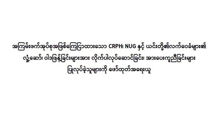 ထိုကဲ့သို့ CRPH၊ NUG နှင့် ယင်းတို့၏ လက်အောက်ခံအဖွဲ့အစည်းများ၊ ယင်းတို့နှင့် ဆက်နွယ်နေသော အဖွဲ့အစည်းများ၊ လူပုဂ္ဂိုလ်များသည် နိုင်ငံတော် တည်ငြိမ်အေးချမ်းရေးကို ပျက်ပြားစေရန်နှင့် အစိုးရယန္တရားများ ပျက်ပြားစေရန် ရည်ရွယ်လျက် လှုံ့ဆော်ခြင်း၊ ဝါဒဖြန့်ခြင်းများ ပြုလုပ်ခဲ့မှုအပေါ် အားပေးကူညီခြင်း ပြုလုပ်ခဲ့သူများအား ဥပဒေနှင့်အညီ ထိရောက်စွာ အရေးယူ သွားမည်ဖြစ်ကြောင်းနှင့် ထိုသို့လှုံ့ဆော်သူ၊ ဝါဒဖြန့်သူများအား ဆက်လက်ဖော်ထုတ် အရေးယူသွားမည်ဖြစ်ကြောင်း မိဘပြည်သူ များ သိရှိနိုင်ရေးအသိပေး သတင်းထုတ်ပြန်အပ်ပါသည်။