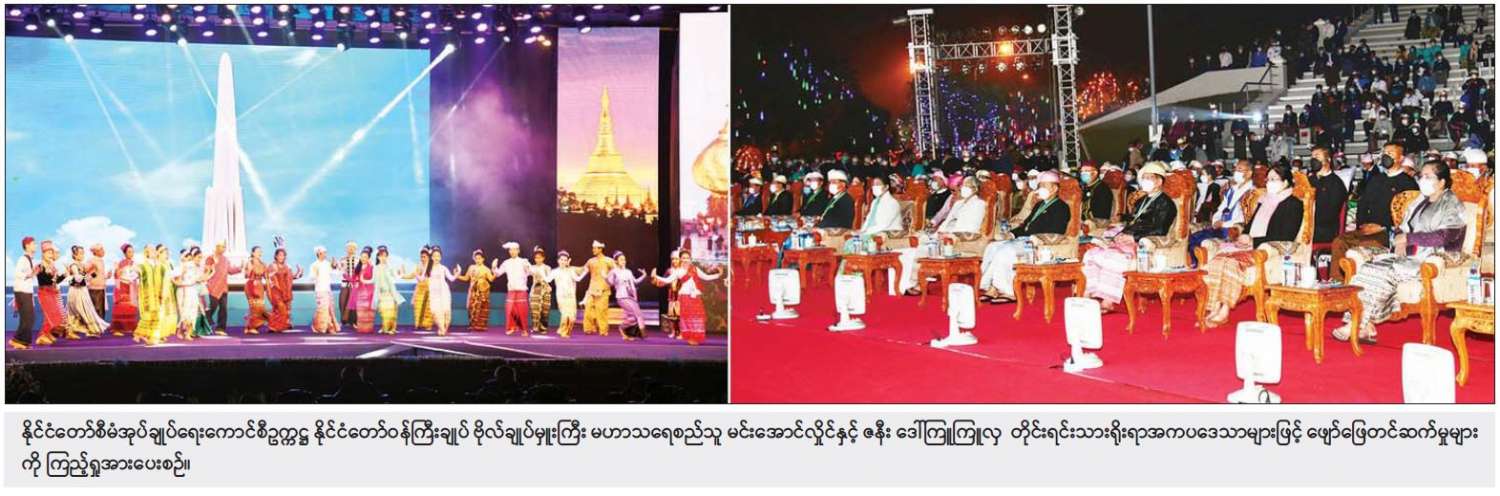 ယင်းနောက် နိုင်ငံတော်ဝန်ကြီးချုပ် ဗိုလ်ချုပ်မှူးကြီး မဟာသရေစည်သူ မင်းအောင်လှိုင်နှင့်ဇနီး ဒေါ်ကြူကြူလှတို့သည် ဂုဏ်ပြုညစာ စားပွဲအခမ်းအနားသို့ တက်ရောက်လာကြသူများနှင့်အတူ သတ်မှတ်နေရာအသီးသီး၌ နေရာယူကြပြီး စိန်ရတုပြည်ထောင်စုနေ့၊ တိုင်းဒေသကြီး နှင့် ပြည်နယ်ကိုယ်စားပြု အလံ၊ မြေပုံနှင့် အမည်စာလုံးဖော် Drone သရုပ်ပြလွှတ်တင်ခြင်း အစီအစဉ်ကို ကြည့်ရှုအားပေးကြသည်။
