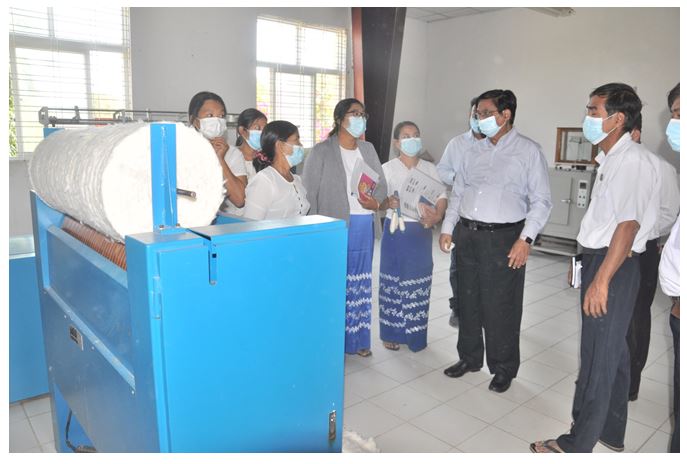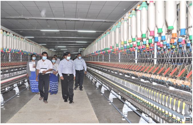 စက်မှုဝန်ကြီးဌာန၊ ပြည်ထောင်စုဝန်ကြီး ဒေါက်တာချာလီသန်းသည် ဖေဖော်ဝါရီ (၁၃) ရက် နံနက်ပိုင်းတွင် မန္တလေးတိုင်းဒေသကြီး၊ မြစ်သားမြို့ရှိ အမှတ် (၇) အထည်စက်ရုံကို ကြည့်ရှုစစ်ဆေးသည်။