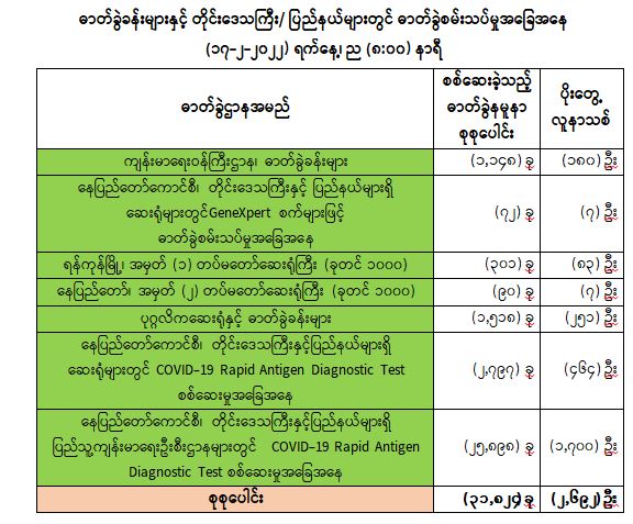 သို့ဖြစ်ပါ၍ ယနေ့အထိ ဓာတ်ခွဲနမူနာစုစုပေါင်း (၆,၈၀၆,၇၈၉)ခုအားစစ်ဆေးခဲ့ပြီး COVID-19 ဓာတ်ခွဲအတည်ပြုလူနာ စုစုပေါင်း (၅၅၆,၂၅၆) ဦး ရှိပြီဖြစ်ပါသည်။