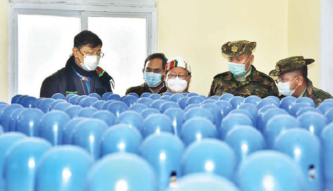 ထို့နောက် နိုင်ငံတော်စီမံအုပ်ချုပ်ရေးကောင်စီအဖွဲ့ဝင် ကာကွယ်ရေးဝန်ကြီးဌာန ပြည်ထောင်စု ဝန်ကြီး ဗိုလ်ချုပ်ကြီး မြထွန်းဦး၊ ဦးမောင်းဟာ ၊ ပြည်နယ်ဝန်ကြီးချုပ်နှင့် တာဝန်ရှိသူများသည် တည်ဆောက်ဆဲ အောက်ဆီဂျင်စက်ရုံနှင့် ၄၀ လီတာဆံ့ အောက်ဆီဂျင်အိုးများဖြင့် အောက်ဆီဂျင်သိုလှောင်ထားရှိမှုအခြေအနေကို သွားရောက် ကြည့်ရှုခဲ့ကြသည်။