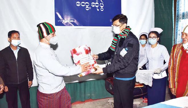 ယင်းနောက် နိုင်ငံတော်စီမံအုပ်ချုပ်ရေးကောင်စီအဖွဲ့ဝင် ကာကွယ်ရေးဝန်ကြီး ဌာန၊ ပြည်ထောင်စု ဝန်ကြီး ဗိုလ်ချုပ်ကြီး မြထွန်းဦးနှင့် အဖွဲ့ဝင်များက ဆေးရုံဝန်ထမ်းနှင့် လူနာများအတွက် ထောက်ပံ့ပစ္စည်းများကို ပေးအပ်ကြရာ ဆေးရုံအုပ်ကြီးနှင့် တာဝန်ရှိသူများက လက်ခံရယူကြသည်။