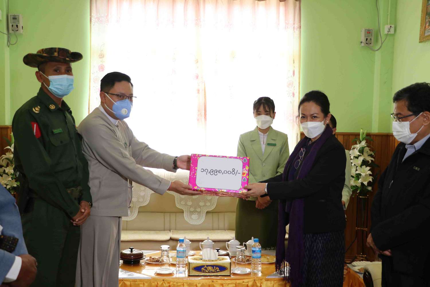 ထို့နောက် ပြည်ထောင်စုဝန်ကြီးနှင့် တာဝန်ရှိသူများသည် ဓနုကိုယ်ပိုင်အုပ်ချုပ်ခွင့်ရ ဒေသ၊   ရွာငံမြို့နယ်နှင့် ပင်းတယမြို့နယ်အတွင်း ဖေဖော်ဝါရီ ၅ ရက်ကဖြစ်ပွားခဲ့သော မိုးသီး ကြွေကျမှုကြောင့် ထိခိုက်ခံစားခဲ့ရသော အိမ်ထောင်စု (၄၂၈)စု၊ လူဦးရေ(၁၈၇၅)ဦးတို့အတွက် ဆန်ရိက္ခာဖိုး ထောက်ပံ့ငွေ ကျပ် (၁၇,၉၉၈,၀၀၀) ကိုလည်းကောင်း၊ ဘေးအန္တရာယ် ဆိုင်ရာစီမံခန့်ခွဲမှုဦးစီးဌာန ဘတ်ဂျက်မှ ထောက်ပံ့သည့် ဆန်ရိက္ခာဖိုး လှူဒါန်းငွေကျပ် (၁,၆၃၈,၀၀၀) ကိုလည်းကောင်း ထောက်ပံ့ ပေးအပ်ကြရာ အကျိုးခံစားခွင့်ရှိသူများကိုယ်စား ဓနုကိုယ်ပိုင်အုပ်ချုပ်ခွင့်ရဒေသ စီမံအုပ်ချုပ်ရေးအဖွဲ့ ဥက္ကဋ္ဌ ဦးအာကာလင်းနှင့် တာဝန်ရှိသူများက လက်ခံကြသည်။