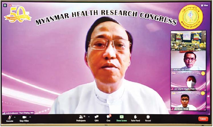 ကျန်းမာရေးဝန်ကြီးဌာနက ကြီးမှူးကျင်းပသော “အကြိမ် (၅၀) မြောက် ရွှေရတုအထိမ်းအမှတ် မြန်မာနိုင်ငံ ကျန်းမာရေးဆိုင်ရာ သုတေသန ညီလာခံ” နောက်ဆုံးနေ့နှင့် ညီလာခံပိတ်ပွဲ အခမ်းအနားကို ယနေ့တွင် ရန်ကုန်မြို့ ဒဂုံမြို့နယ် အမှတ် ၅ ဇီဝကလမ်းရှိ ဆေးသုတေသန ဦးစီးဌာန၌ ဗီဒီယိုကွန်ဖရင့်စနစ် (Virtual) နှင့် ကိုယ်တိုင်တက်ရောက်ခြင်း (In-person) ပူးတွဲလျက် ပေါင်းစပ် (Hybrid) အသွင်ဖြင့် ကျင်းပသည်။