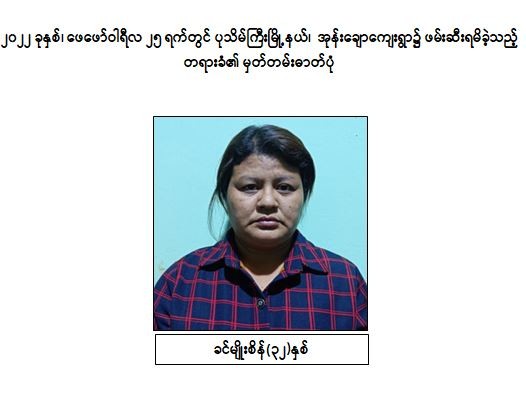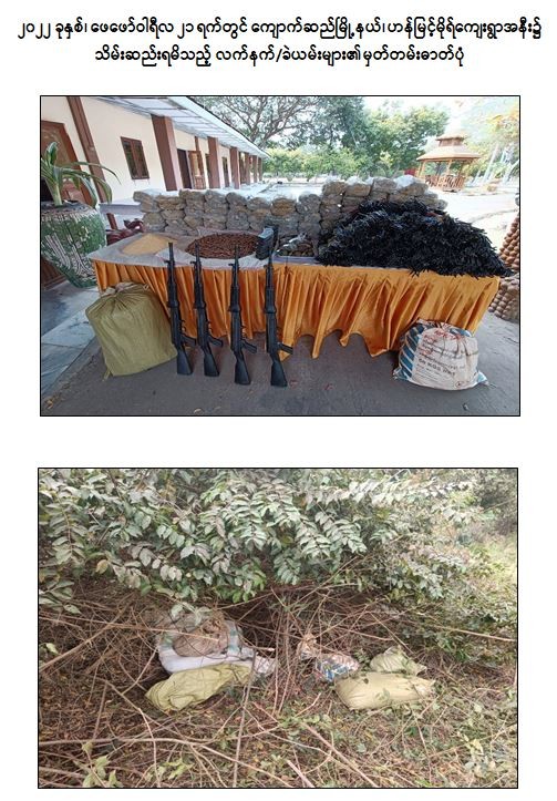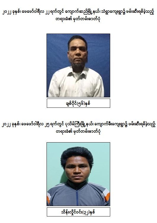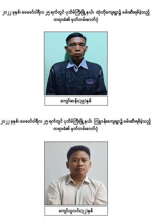 သို့ဖြစ်ပါ၍ ဖမ်းဆီးရမိ တရားခံများအား ဥပဒေအရ ထိရောက်စွာ အရေးယူနိုင်ရေး ဆက်လက်ဆောင်ရွက်သွားမည်ဖြစ်ပြီး အကြမ်းဖက်မှု ဆောင်ရွက်နေသူများအား ပြည်သူတစ်ရပ်လုံးက ဝိုင်းဝန်းကာကွယ် တိုက်ဖျက်ကြရန်နှင့် ပြစ်မှုကျူးလွန်ရာတွင် ပါဝင်ပတ်သက်သူများ၊ နောက်ကွယ်မှ ထောက်ပံ့ပေးလျက်ရှိသော ဆက်စပ်တရားခံများအား အမြန်ဆုံးဖမ်းဆီးရမိရေးအတွက် ၎င်းတို့ ပုန်းခိုရာနေရာများ၊ လှုပ်ရှားသွားလာနေထိုင်မှု သတင်းများရရှိပါက သက်ဆိုင်ရာသို့ လျှို့ဝှက်စွာ သတင်းပေးတိုင်ကြား နိုင်ပါကြောင်း၊ သတင်းပေးသူနှင့် ဖမ်းဆီးပေးသူ များအား ထိုက်တန်စွာ လျှို့ဝှက်၍ ဆုငွေများ ချီးမြှင့်ပေးမည်ဖြစ်ကြောင်းနှင့် မြို့ရွာများ အမြန်ဆုံးအေးချမ်း တည်ငြိမ်ရေးအတွက် ပြည်သူတစ်ရပ်လုံး ပူးပေါင်းပါဝင် ကြိုးပမ်းဆောင်ရွက်နိုင်ပါရန် မေတ္တာရပ်ခံအပ်ပါကြောင်း အသိပေး သတင်းထုတ်ပြန်အပ်ပါသည်။