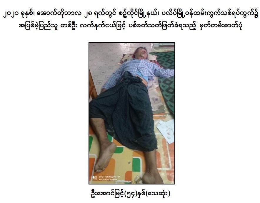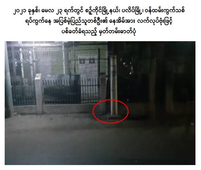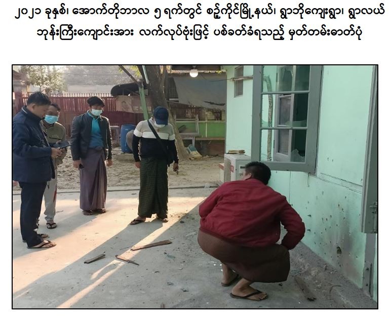 - ၂၀၂၁ခုနှစ်၊ မေလ ၂၃ ရက်တွင် အောင်ကိုကိုသည် စဉ့်ကိုင်မြို့နယ်၊ ပလိပ်မြို့၊ ဝန်ထမ်းကွက်သစ် ရပ်ကွက်နေ အပြစ်မဲ့ပြည်သူ တစ်ဦး၏နေအိမ်အား လက်လုပ်ဗုံးဖြင့် လည်းကောင်း။