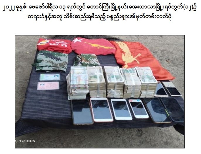 နိုင်ငံတော်မှ အကြမ်းဖက်အဖွဲ့အစည်းအဖြစ် သတ်မှတ်ထားသည့် CRPH၊ NUG နှင့် PDF အမည်ခံ အကြမ်းဖက်အဖွဲ့ဝင်များ မြို့/ရွာများတွင် လှုပ်ရှားသွားလာမှု မရှိစေရေး ဖော်ထုတ်ဖမ်းဆီးခြင်းများ ဆောင်ရွက်လျက်ရှိရာ ၂၀၂၂ ခုနှစ်၊ ဖေဖော်ဝါရီလ ၁၃ ရက်တွင် အေးချမ်းစွာနေထိုင်လိုသည့် တာဝန်သိပြည်သူများ၏ သတင်းပေးချက်အရ လုံခြုံရေးပူးပေါင်းအဖွဲ့သည် တောင်ကြီး မြို့နယ်၊ အေးသာယာမြို့၊ ရပ်ကွက်(၁၂)၊ အိမ်အမှတ်(၇၂)၌ ကျောက်ဆည် PDF အကြမ်းဖက်အဖွဲ့၏ ဘဏ္ဏာရေးနှင့် ညှိနှိုင်းရေးတာဝန်ခံ တင်မောင်ထွေး(ခ)ရန်အောင်ထွေး(၄၂)နှစ်အား လက်ကိုင်ဖုန်း ၈ လုံး၊ ငွေကျပ် ၉၀ သိန်း၊ ပြောက်ကျားဝတ်စုံ တို့နှင့်အတူ ဖမ်းဆီးရမိခဲ့သည်။