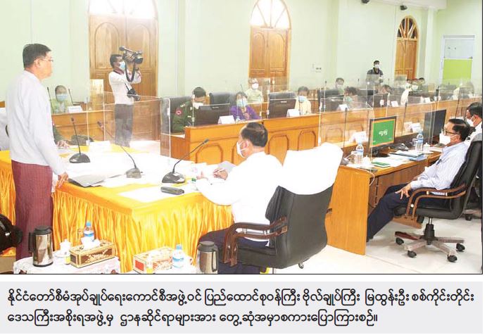 တွေ့ဆုံစဉ် နိုင်ငံတော်စီမံအုပ်ချုပ်ရေးကောင်စီအဖွဲ့ဝင် ကာကွယ်ရေးဝန်ကြီးဌာန ပြည်ထောင်စုဝန်ကြီး ဗိုလ်ချုပ်ကြီး မြထွန်းဦး က အမှာစကားပြောကြားပြီး စစ်ကိုင်းတိုင်းဒေသကြီးအစိုးရအဖွဲ့ ဝန်ကြီးချုပ် ဦးမြတ်ကျော်နှင့် တာဝန်ရှိသူများက ဒေသဖွံ့ ဖြိုးရေး၊ တရားဥပဒေစိုးမိုးရေးနှင့် နယ်မြေလုံခြုံရေးစီမံဆောင်ရွက်ထားရှိမှု အခြေအနေများ၊ စိုက်ပျိုးရေးကဏ္ဍ ဆောင်ရွက်ထားရှိမှု အခြေအနေများ၊ မွေးမြူရေးကဏ္ဍ ဆောင်ရွက်ထားရှိမှု အခြေအနေများ၊ ကိုဗစ်-၁၉ ကာကွယ်ဆေးထိုးနှံမှု အခြေအနေများနှင့် ရောဂါကာကွယ် ထိန်းချုပ်ရေး ဆောင်ရွက်ထားရှိမှုအခြေအနေများ၊ အခြေခံပညာကျောင်းများ ဖွင့်လှစ်ဆောင်ရွက်ထားရှိမှု အခြေအနေများ၊ ပန်းခင်းစီမံချက် ဆောင်ရွက်ထားရှိမှုအခြေအနေများနှင့် တိုင်းဒေသကြီးအတွင်းရှိ လမ်းမကြီးများအခြေအနေများကို ရှင်းလင်းတင်ပြခဲ့ပြီး နိုင်ငံတော် စီမံအုပ်ချုပ်ရေးကောင်စီအဖွဲ့ဝင် ကာကွယ်ရေးဝန်ကြီးဌာန၊ ပြည်ထောင်စုဝန်ကြီးက တင်ပြချက် များအပေါ် လိုအပ်သည်များကို ညှိနှိုင်းဆောင်ရွက်ပေးသည်။ ထို့နောက် စစ်ကိုင်းတိုင်းဒေသကြီး အစိုးရအဖွဲ့ရုံး၊ ချင်းတွင်းခန်းမ၌ ဌာနဆိုင်ရာများကိုယ်စား တာဝန်ရှိသူများကို လက်ဆောင်ပစ္စည်များ ပေးအပ်ခဲ့ပြီး ချင်းတွင်းရိပ်သာ(၁)၌ မုံရွာမြို့၊ ရပ်မိရပ်ဖများနှင့် ရင်းရင်းနှီးနှီးတွေ့ဆုံနှုတ်ဆက်ကာ အမှတ်တရလက်ဆောင်ပစ္စည်းများ ပေးအပ်ခဲ့ကြောင်း သတင်းရရှိသည်။