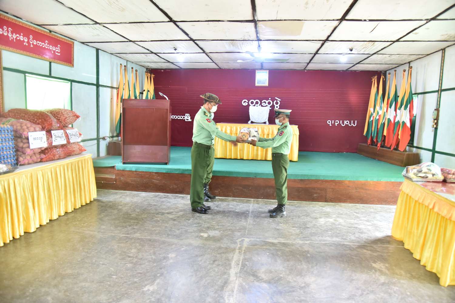 ယင်းနောက် ကသာခရိုင်စီမံအုပ်ချုပ်ရေးအဖွဲ့ ဥက္ကဋ္ဌ ဦးထွန်းကျော်ကျော်က နယ်မြေ ဒေသအခြေအနေ များကို ရှင်းလင်းတင်ပြရာ ပြည်ထောင်စုဝန်ကြီးက ပေါင်းစပ်ညှိနှိုင်းဆောင်ရွက်ပေးပြီး စားသောက်ဖွယ်ရာများ ပေးအပ်ရာ ခရိုင်အဆင့်ဌာနဆိုင်ရာများကိုယ်စား ခရိုင်စီမံအုပ်ချုပ်ရေးအဖွဲ့ ဥက္ကဋ္ဌ ဦးထွန်းကျော်ကျော်နှင့် မြို့နယ်အဆင့်ဌာန ဆိုင်ရာများကိုယ်စား မြို့နယ်စီမံအုပ်ချုပ်ရေးအဖွဲ့ ဥက္ကဋ္ဌ ဦးထက်ဝင်း တို့က လက်ခံရယူကြသည်။