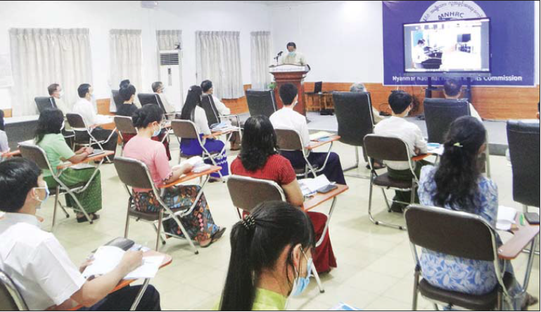 မြန်မာနိုင်ငံ အမျိုးသားလူ့အခွင့် အရေးကော်မရှင်ရုံးမှ အရာထမ်း၊ အမှုထမ်းများအတွက် ဌာနတွင်း လူ့အခွင့်အရေး အသိပညာပေး သင်တန်း အမှတ်စဉ် (၁/၂၀၂၂) ဖွင့်လှစ်ခြင်း အခမ်းအနားကို ယနေ့ မွန်းလွဲ ၁ နာရီတွင် ကော်မရှင်ရုံး Conference Room ၌ ကိုဗစ်-၁၉ ကပ်ရောဂါ ကာလအတွင်း လိုက်နာနေထိုင်ရမည့် စည်းမျဉ်းစည်းကမ်းများနှင့်အညီ ကျင်းပသည်။