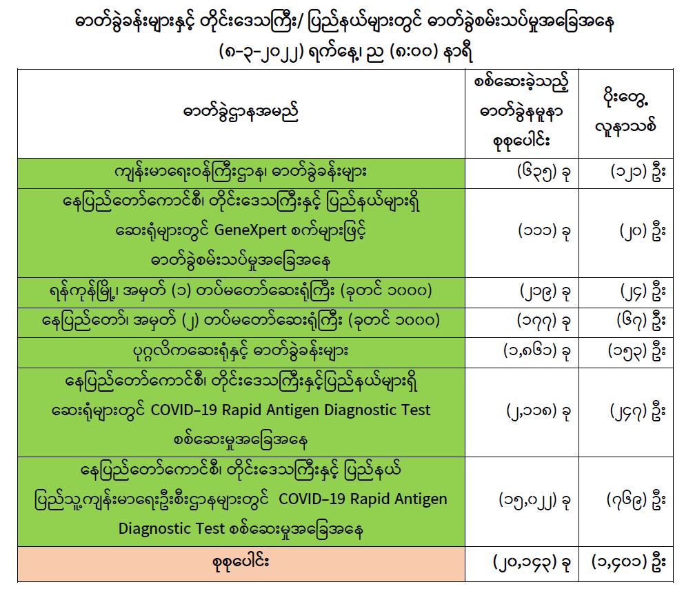 သို့ဖြစ်ပါ၍ ယနေ့အထိ ဓာတ်ခွဲနမူနာစုစုပေါင်း (၇,၂၉၄,၄၉၄) ခုအား စစ်ဆေးခဲ့ပြီး COVID-19 ဓာတ်ခွဲအတည်ပြုလူနာ စုစုပေါင်း (၆၀၁,၀၂၀) ဦး ရှိပြီ ဖြစ်ပါသည်။