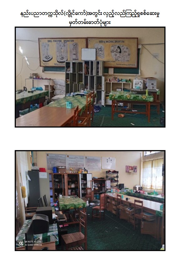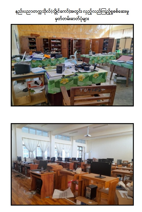 နည်းပညာတက္ကသိုလ် (လွိုင်ကော်)ရှေ့တွင် ဖောက်လုပ်ထားသည့် ကျေးရွာချင်းဆက်လမ်းမှာ လွိုင်ကော်မြို့မှ အကြမ်းဖက်သမားများ အခြေပြုနေထိုင် လှုပ်ရှားခဲ့သည့် နမ့်မယ်ခုံကျေးရွာနှင့် မိုးဗြဲမြို့များသို့ ဆက်သွယ်ထားပြီး တိုက်ပွဲဖြစ်ပွားရာတွင် အကြမ်းဖက်သမားများ အများဆုံးအသုံးပြုခဲ့သည့် လမ်းကြောင်းတစ်ခုဖြစ်ကြောင်း၊ လမ်းကြောင်းပေါ်ရှိ ရပ်ကွက်၊ ကျေးရွာများအတွင်း၌လည်း ဒေသခံများ တိမ်းရှောင်လျက်ရှိသဖြင့် နေအိမ်များနှင့် ဌာနဆိုင်ရာ အဆောက်အဦများမှ ပစ္စည်းများအား အကြမ်းဖက်သမားများမှ ဖျက်ဆီးခြင်း၊ ခိုးယူခြင်းများ လုပ်ဆောင်ခဲ့သောကြောင့် ပြည်သူတို့၏ စည်းစိမ်ဥစ္စာများ ပျက်စီးဆုံးရှုံးခဲ့ရကြောင်း သိရှိရသည်။ ယခုတက္ကသိုလ်အတွင်းမှ သင်ကြားမှု၊ သင်ယူမှု အထောက်အကူပြုပစ္စည်းများ ပျောက်ဆုံး၊ ပျက်စီးခဲ့ရခြင်းသည်လည်း အစိုးရ၏ အုပ်ချုပ်မှုယန္တရားများ ပျက်စီးစေရန်နှင့် ပညာသင်ကြားမှုကို ပျက်ပြားစေရန် ရည်ရွယ်လုပ်ဆောင်လျက်ရှိသည့် KNPP အဖွဲ့နှင့် PDF အမည်ခံ အကြမ်းဖက်အဖွဲ့များ၏ လုပ်ရပ်များပင်ဖြစ်နိုင်ကြောင်း သုံးသပ်တွေ့ရှိရသည်။